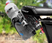 写真のようにサドルレールに挟んで取り付けます。取り付け例のように別売マルチストライクリペアホルダを併用することでチューブやCO2ボンベを固定できます。